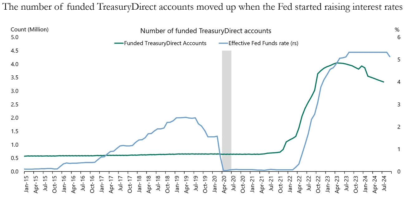 Apollo: Cuando los tipos de interés de la FED eran cero, el número de hogares con una cuenta TreasuryDirect (donde se pueden comprar y vender bonos del gobierno) era de unos 700.000. Pero una vez que la FED empezó a subir los tipos de interés, el número de hogares con una cuenta TreasuryDirect aumentó a 4 millones. Y ahora, incluso antes de que la FED empezara a recortarlos, el número de cuentas empezó a disminuir. la pregunta clave es qué harán los hogares con sus tenencias de bonos. El resultado más probable es que los hogares retirarán dinero del extremo inicial de la curva y lo colocarán en crédito y otros activos de renta fija de mayor rendimiento. (Se explicará más adelante la curva)