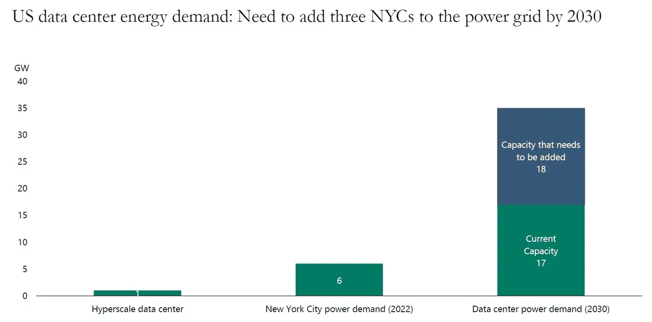 Apollo: Las estimaciones de necesidad energética para centros de datos para el año 2030 es de 18GW. La demanda energética de NY es de 6GW, en otras palabras, será necesario añadir 3 ciudades de NY a la red eléctrica de EEUU.