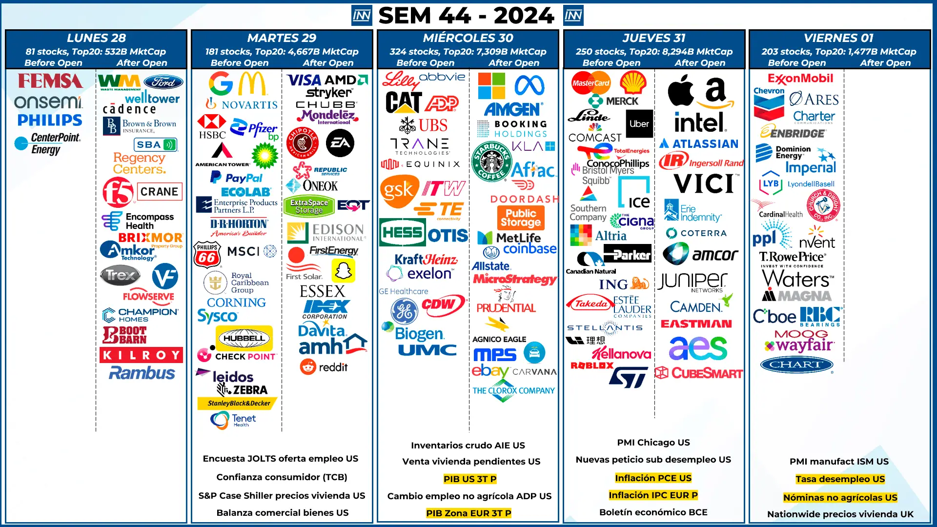 - Resultados Trimestrales: Esta es, sin duda alguna, la semana más importante de fin de mes, tenemos a 5 de las 7 magníficas: GOOGL, MSFT, META, AAPL y AMZN, y aparte cientos de compañías interesantes.