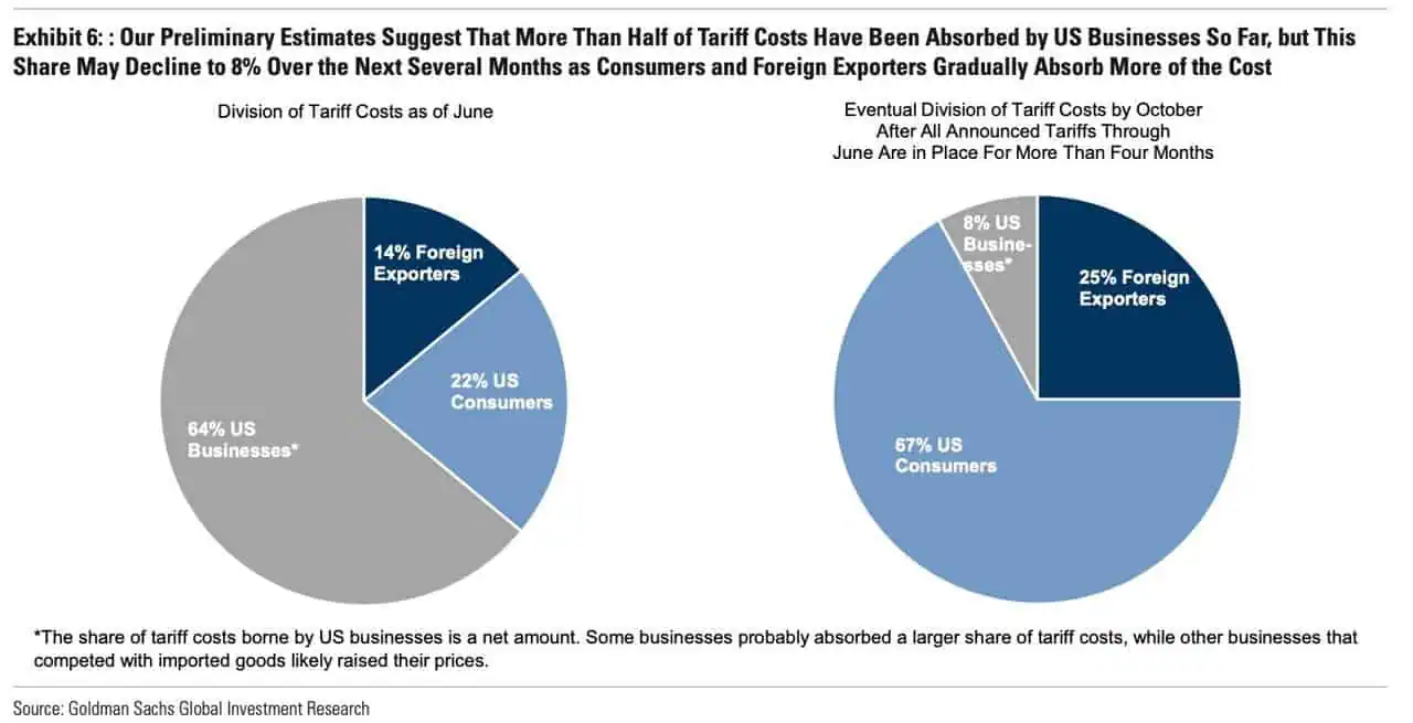 GS: Las empresas estadounidenses actualmente asumen la mayor parte de los costos incrementales derivados del aumento de aranceles, lo cual perjudica los márgenes de ganancia. Los analistas de Goldman Sachs prevén que los consumidores eventualmente asumirán la mayor parte de los costos mediante el aumento de precios.