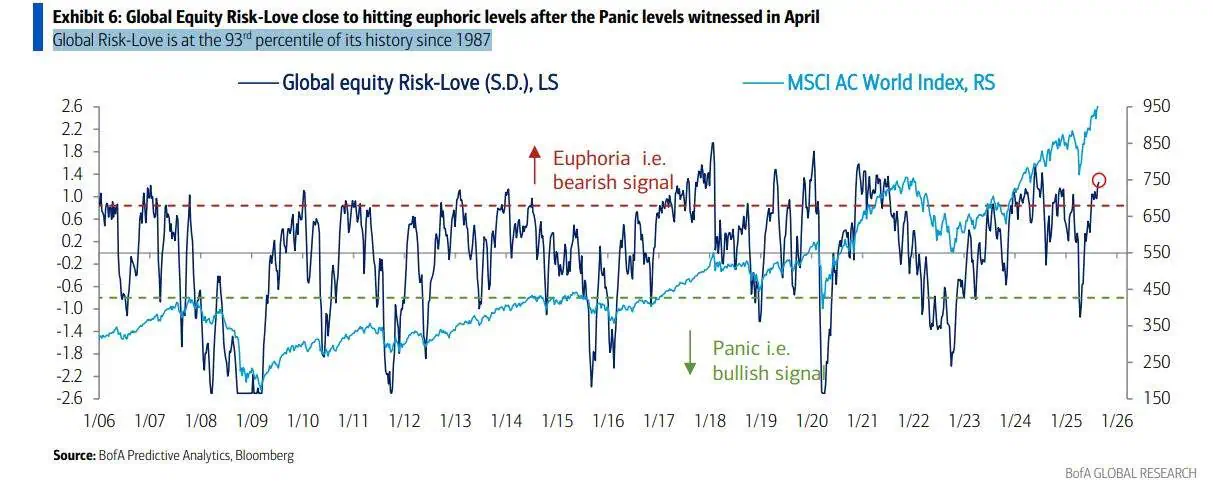 BofA: El indicador Global Risk-Love se encuentra en el percentil 93 de su historia desde 1987, primera señal de euforia.