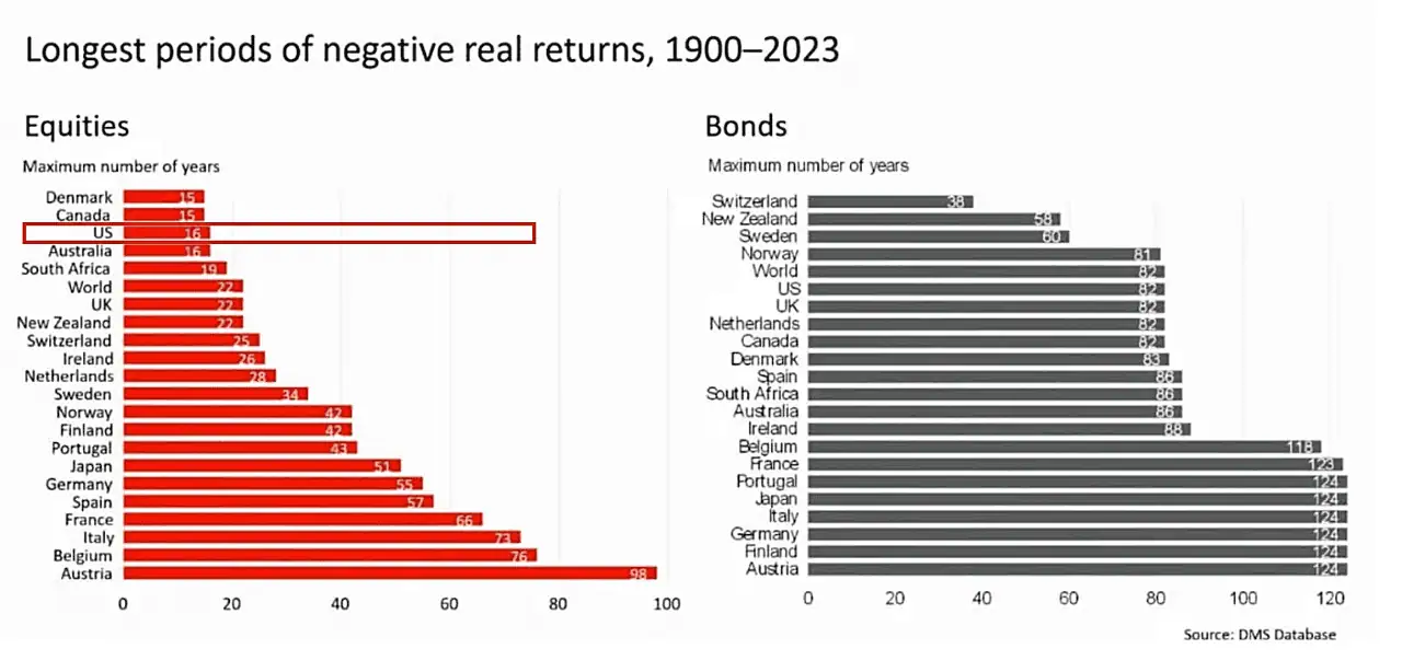 El mercado de valores de EEUU ha tenido hasta 16 años consecutivos de rendimientos reales negativos en el pasado, mientras que su mercado de bonos ha sido de 82 años. (DMSDatabase)