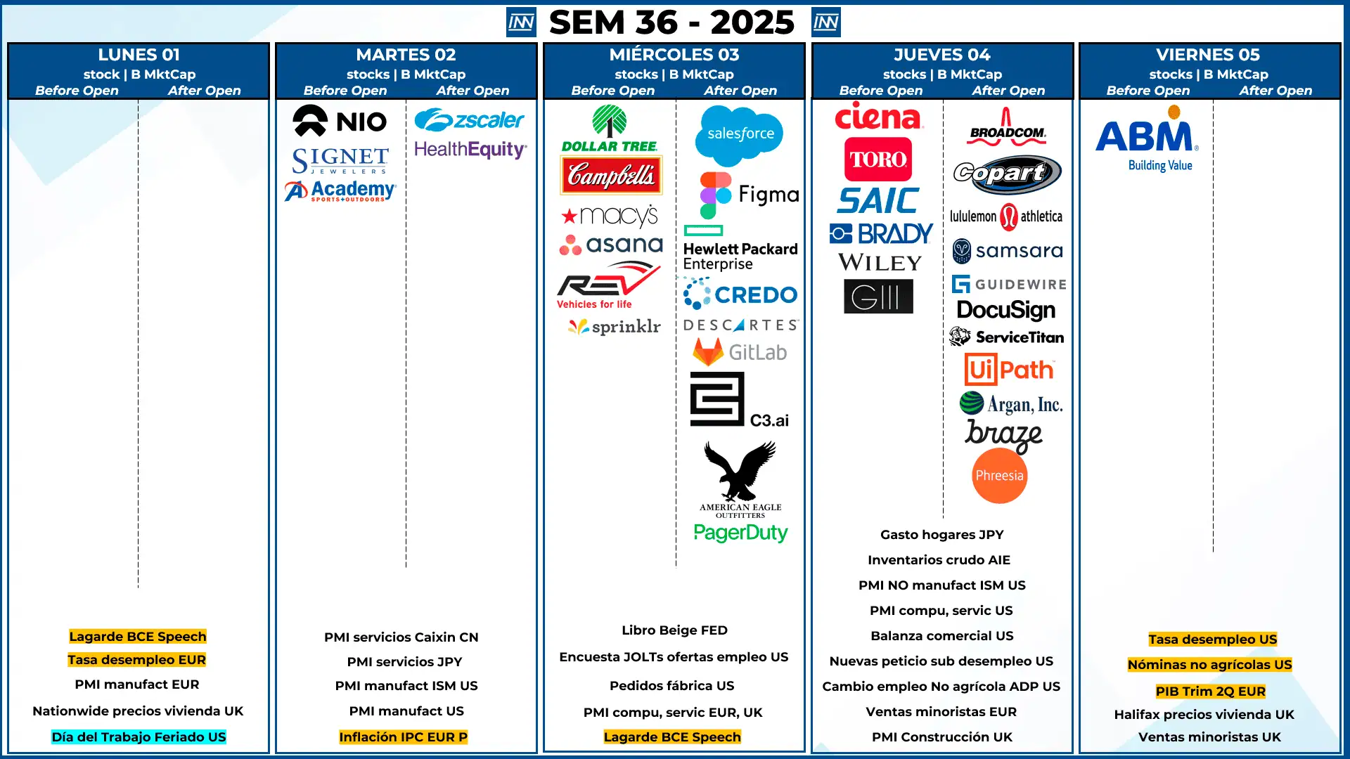- Resultados Trimestrales: los días más imporantes jueves y miércoles en el after hours, con empresas como AVGO, CRM, NIO, etc…