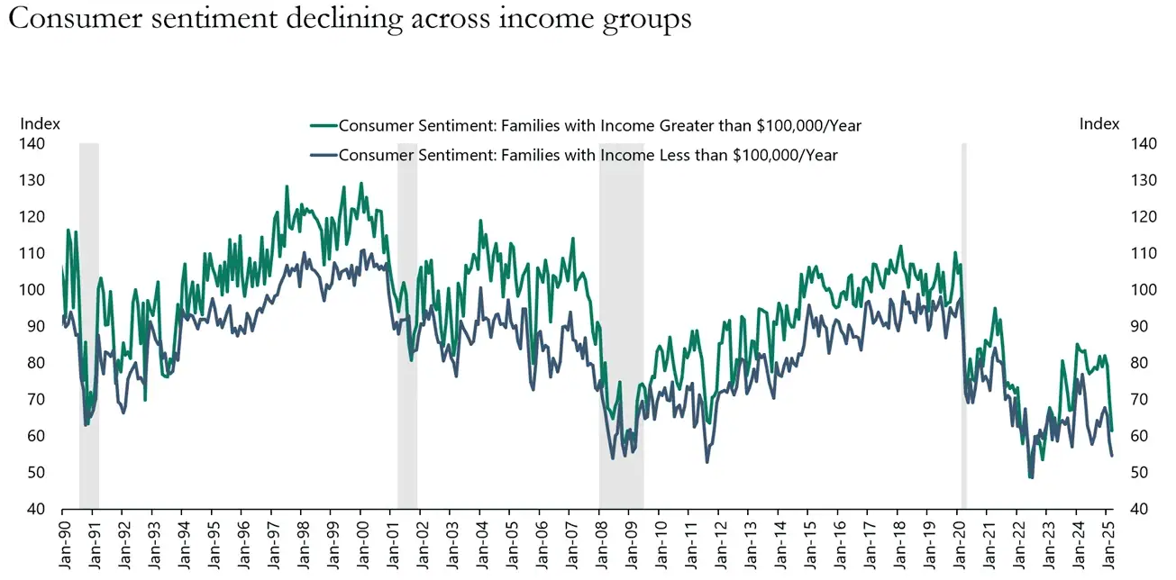 Apollo: La encuesta sobre el sentimiento del consumidor realizada en marzo por la Universidad de Michigan muestra que La confianza del consumidor está disminuyendo rápidamente tanto para los hogares que ganan más de $100,000 como para los que ganan menos de $100,000