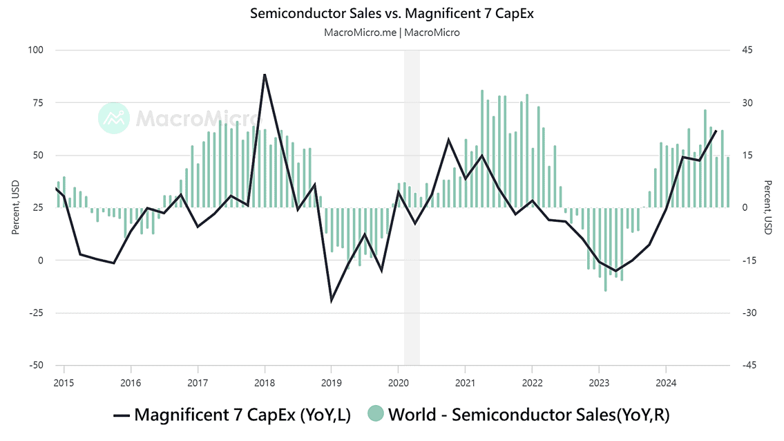 MacroMicro: Cuando los gigantes tecnológicos aumentan sus inversiones de capital, los fabricantes de equipos semiconductores y chips de la cadena de suministro suelen beneficiarse con un aumento de los pedidos y los ingresos. A medida que las empresas incrementan la producción de chips y amplían sus centros de datos, las ventas globales de semiconductores se mantienen sólidas. La tendencia indica un crecimiento sostenido del gasto en IA, lo que refuerza el potencial a largo plazo del sector.