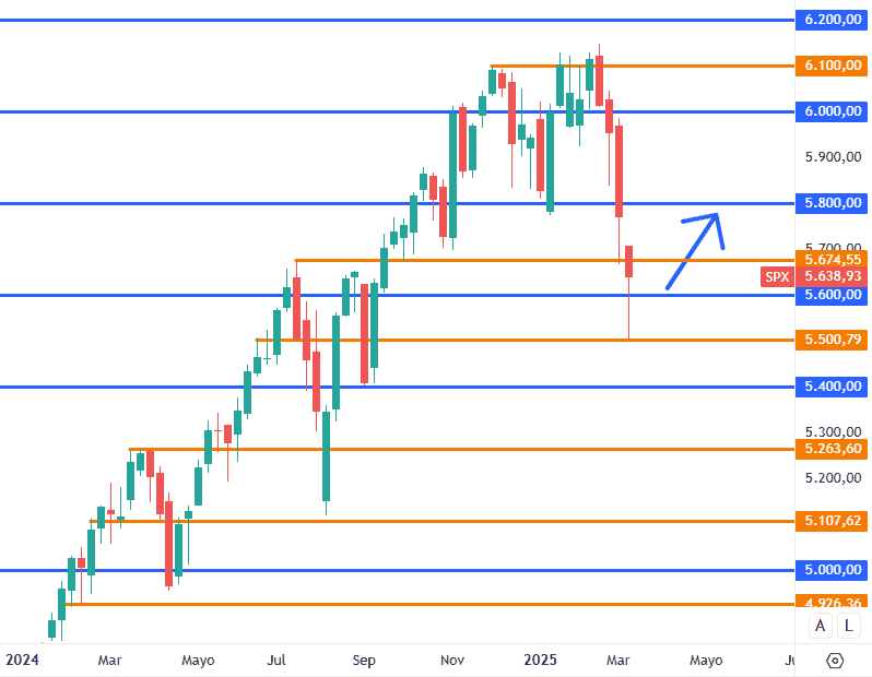 Se mantiene la proyección anterior… ahora, con una Caída del 10% desde máximos, sigue siendo lógico pensar en algún descanso (al menos hasta las palabras de Powell), por lo pronto con dirección hacia los 5,800 puntos.