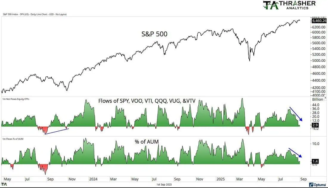 Thrasheranalytics: Los inversores parecen estar retirando activos de los principales ETF de índices bursátiles… ¿Se debe esto a que los operadores intentan anticiparse a la estacionalidad bajista de septiembre? Si se equivocan, esta actividad de flujo bajista podría generar un movimiento contrario que impulse el siguiente tramo alcista
