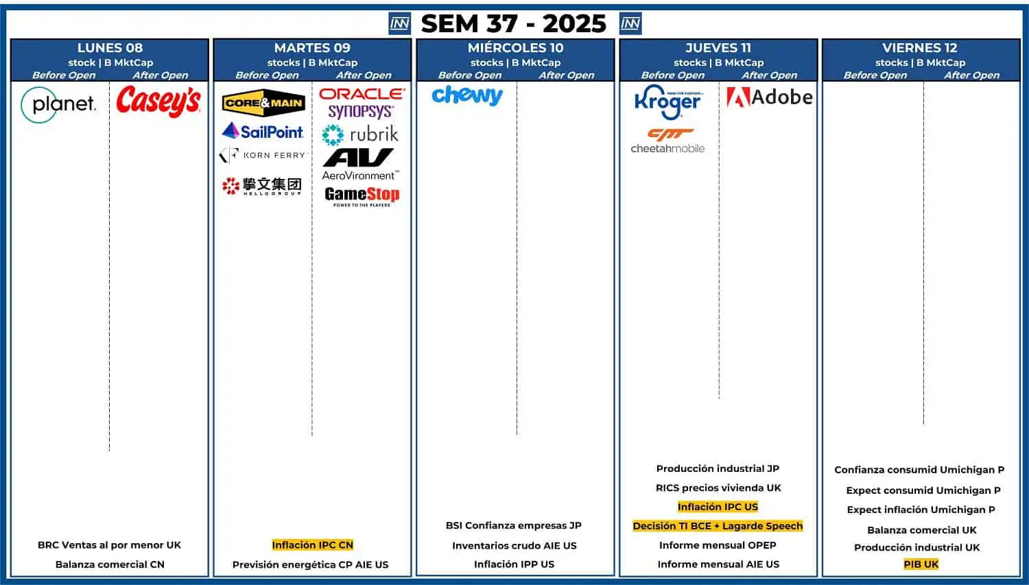 - Resultados Trimestrales: no tenemos compañías que muevan el mercado, pero inversores podrían estar esperando resultados de ORCL y ADBE