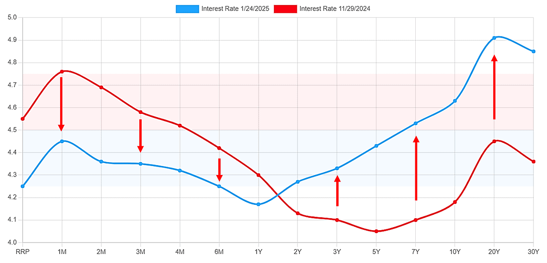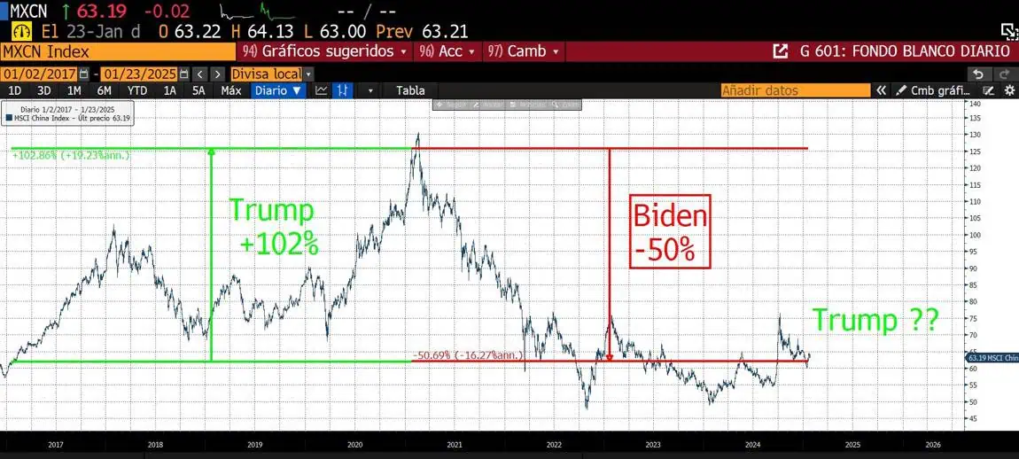 Si los rendimientos de los bonos suben de forma brusca (hemos pasado del 29 de noviembre de 2024 al 24 de enero de 2025 de una yield a 10 años del 4.18 al 4.63, 45 pbs), podría desencadenar en un evento bajista. Aquí tenemos preocupaciones por la inflación, posibles mayores tasa de interés o incluso hasta inestabilidad económica.
