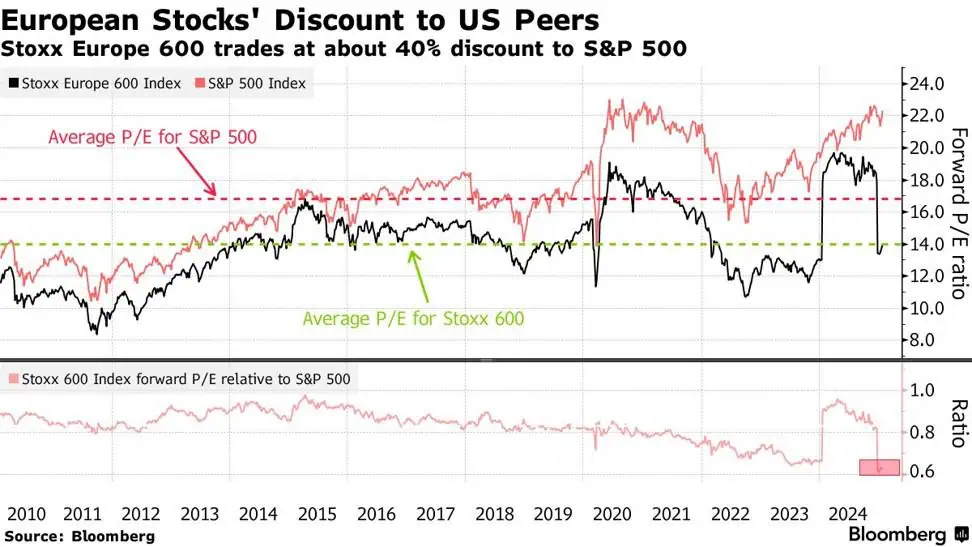 Bloomberg: Bloomberg: EuroStoxx 600 cotiza a un descuento aprox. del 40% frente al SP500