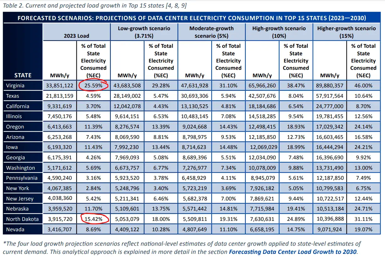 En 2023 los centros de datos de Virginia (aprox.+35% de los centros de datos del mundo) consumían el 26% de la electricidad del estado. Según proyecciones del Instituto de Investigación de Energía Eléctrica de EEUU, con un escenario de 15% de crecimiento para el 2030, los centros de datos podrían llegar a consumir aprox. el 50% de electricidad del estado de Virginia.