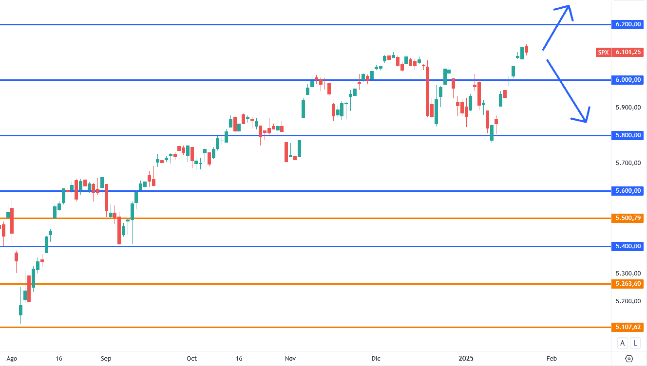 Volatilidad extrema en, posiblemente, la semana más importante del Q1 del 2025. Si mantenemos el impulso el SP500 podría romper la barrera de los 6,200. Difícil de prever movimientos con tantos eventos importantes en 1 semana.