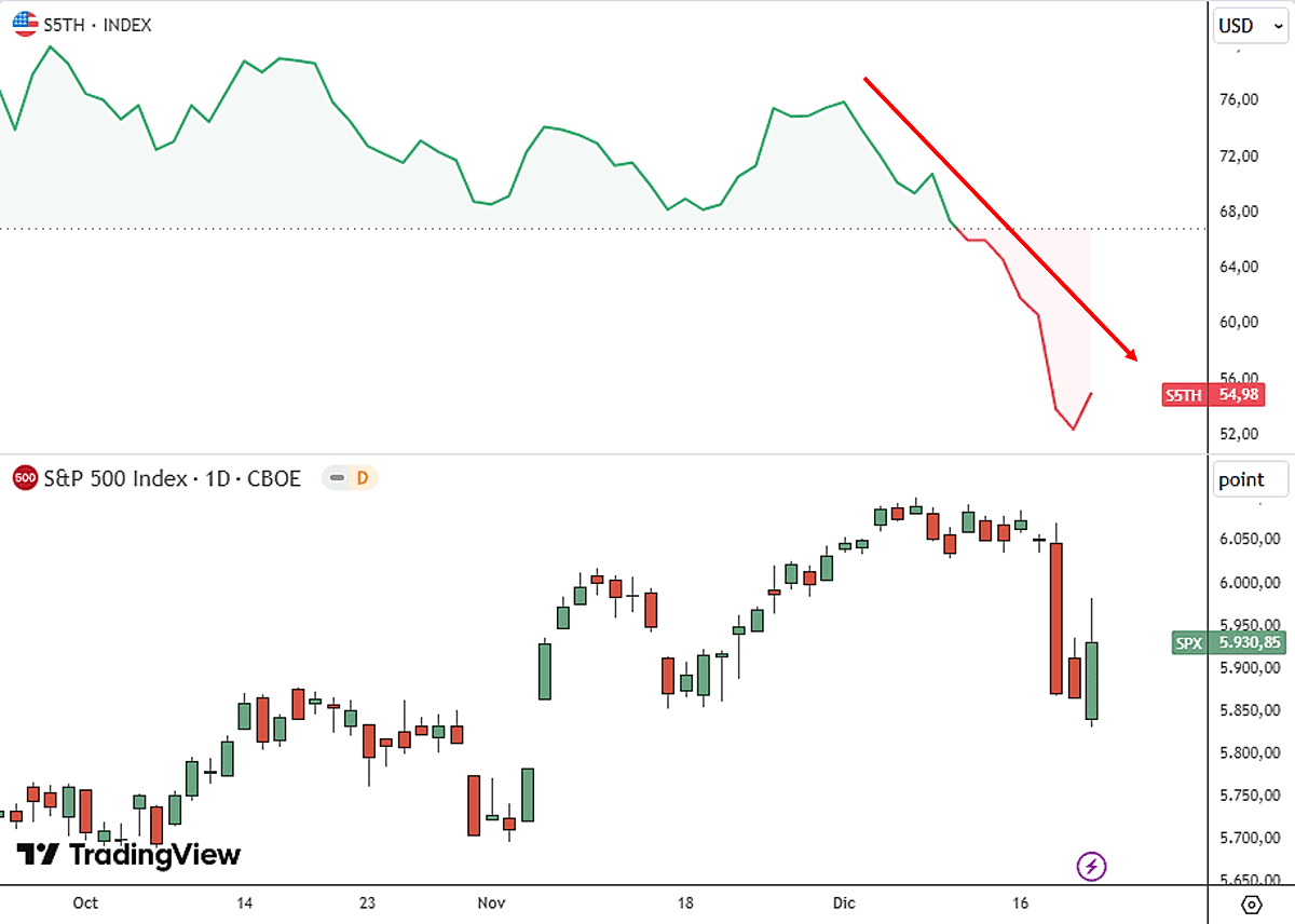 2) El deterioro en la amplitud de mercado (% de compañías del SP500 por encima de la media de 200 días) desde inicios de diciembre (75%) al cierre del último viernes (55%). Aún hay bastante concentración en el SP500, solo el 55% de las empresas está por en cima de su media de 200d, mientras que la caída desde máximos representa solo el 2.6%