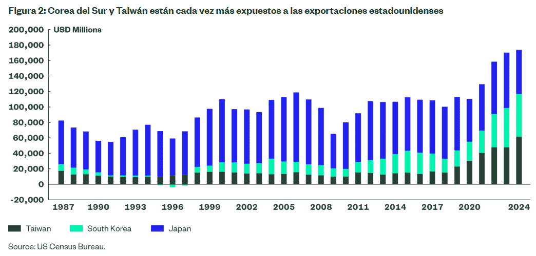 StateStreet: Taiwán y Corea del Sur, economías altamente orientadas a la exportación con vínculos crecientes con EEUU, podrían enfrentar desafíos directos. EEUU representa aproximadamente el 20%-30% del consumo mundial de productos electrónicos, pero carece de una cadena de suministro completamente desarrollada para muchos productos y componentes tecnológicos. Cualquier alteración significativa en este mercado podría reducir la demanda de productos tecnológicos de estos países. Además, los aranceles podrían generar mayores costos para los consumidores y las empresas estadounidenses, lo que a su vez alberga el potencial de debilitamiento del consumo.