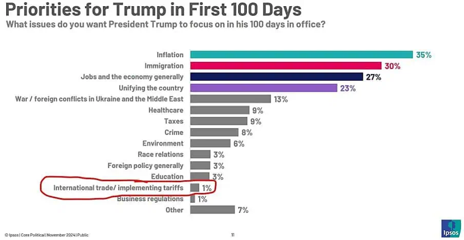Schwab: Los aranceles pueden seguir aumentando, pero parece que Trump podría utilizar los anuncios de aranceles extremos como una herramienta de política económica para obtener acciones o concesiones. Trump no tiene un mandato para implementar aranceles, según los datos de las encuestas sobre las intenciones de voto. Los datos de las encuestas muestran que los votantes esperan que Trump se centre en la inflación (35%), no en la implementación de aranceles (solo 1%).
