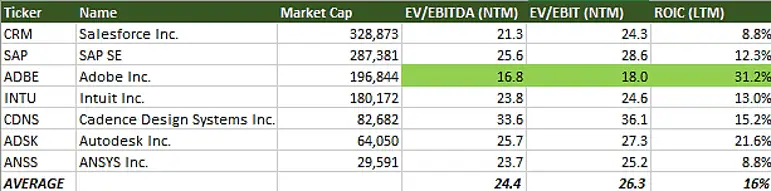 StockOpine: Adobe cotiza actualmente a los múltiplos EV/EBIT más bajos entre las empresas de software de gran capitalización altamente rentables. Al mismo tiempo, tiene los mayores retornos sobre el capital.