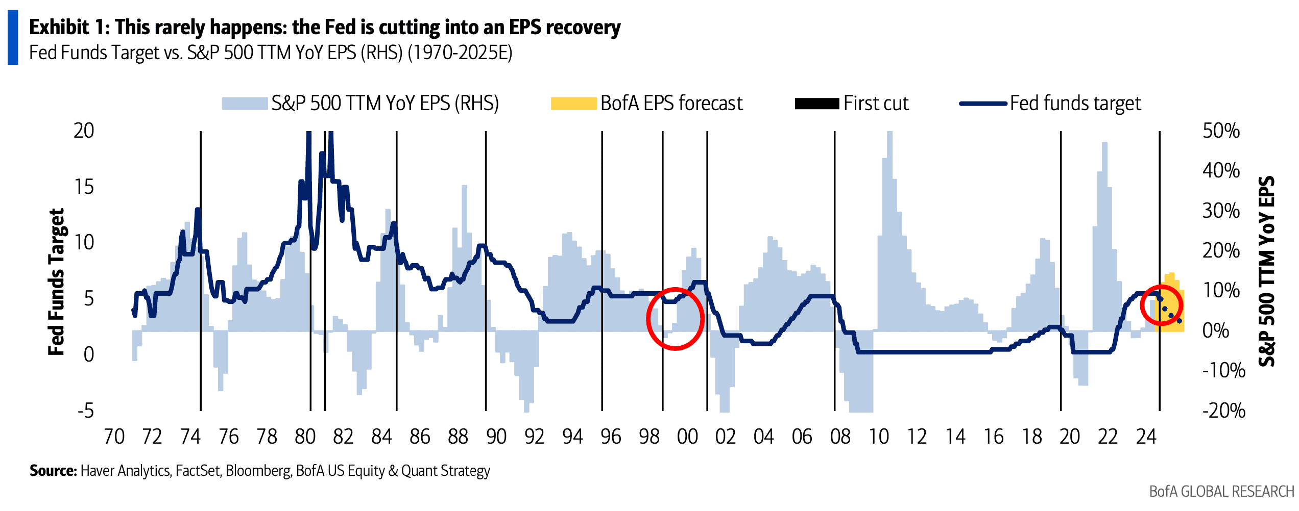BofA: esto es raro la FED está recortando en una recuperación de EPS. Históricamente, las ganancias casi siempre se han desacelerado cuando la Fed recorta las tasas por primera vez, pero ese no es el caso hoy.