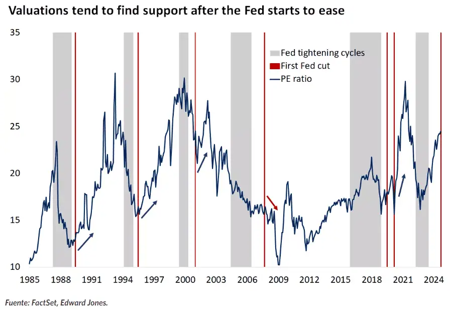 EdwardJones: Históricamente, las valoraciones han tendido a aumentar después del inicio de la flexibilización. Sin embargo, debido a que las valoraciones actualmente son elevadas en relación con la historia, creemos que el alza de las acciones será más modesta que los ciclos de aterrizaje suave anteriores.