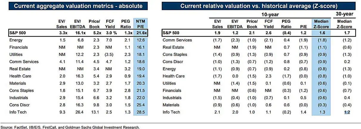 GS: SP500 valorización por sectores.