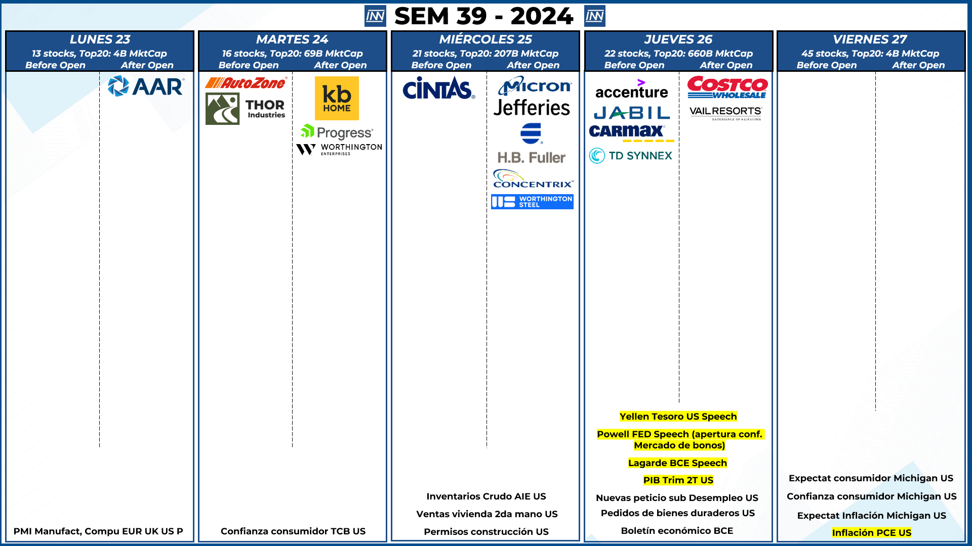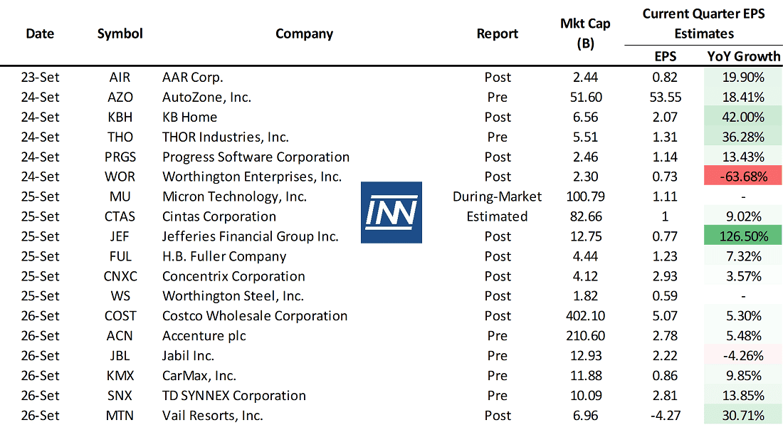 - Resultados Trimestrales: No hay compañías importantes que hagan mover al mercado. Algunas importantes: COST, MU