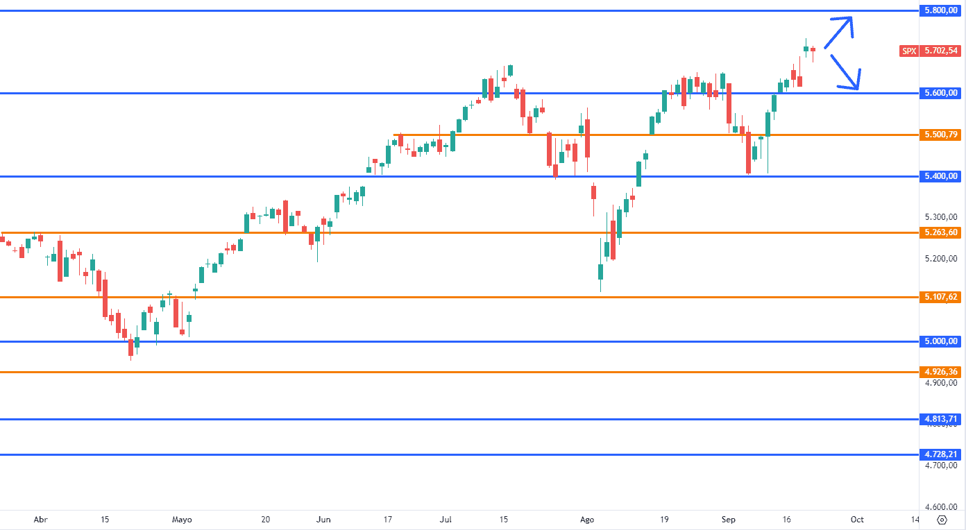 Como se mencionó la semana anterior de haber 50 pbs veremos nuevos máximos históricos. Para esta semana posiblemente veamos un ligero descanso en los 5600 para posteriormente buscar los 5800, de ser positivos los datos macro claves para esta semana, el mercado seguirá subiendo.