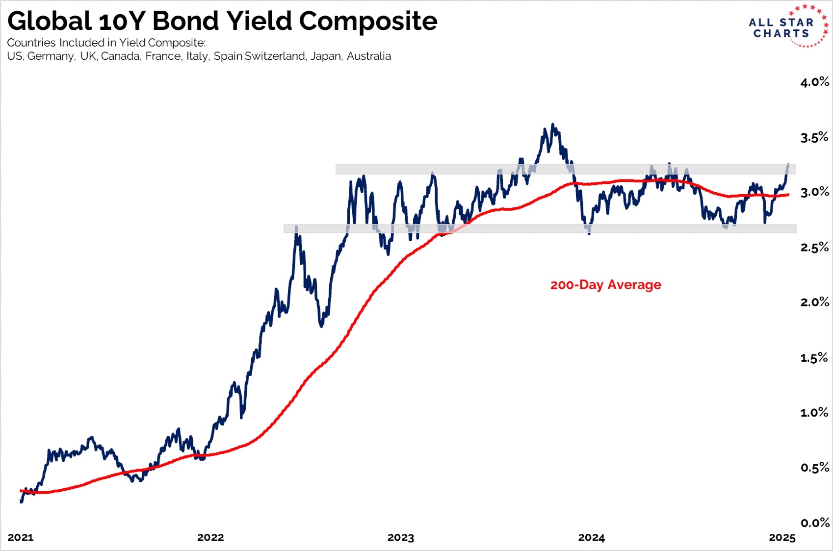 Y esto no solo sucede en EEUU, el rendimiento de los bonos a 10 años globales se encuentra en un nivel importante. (AllStarCharts)