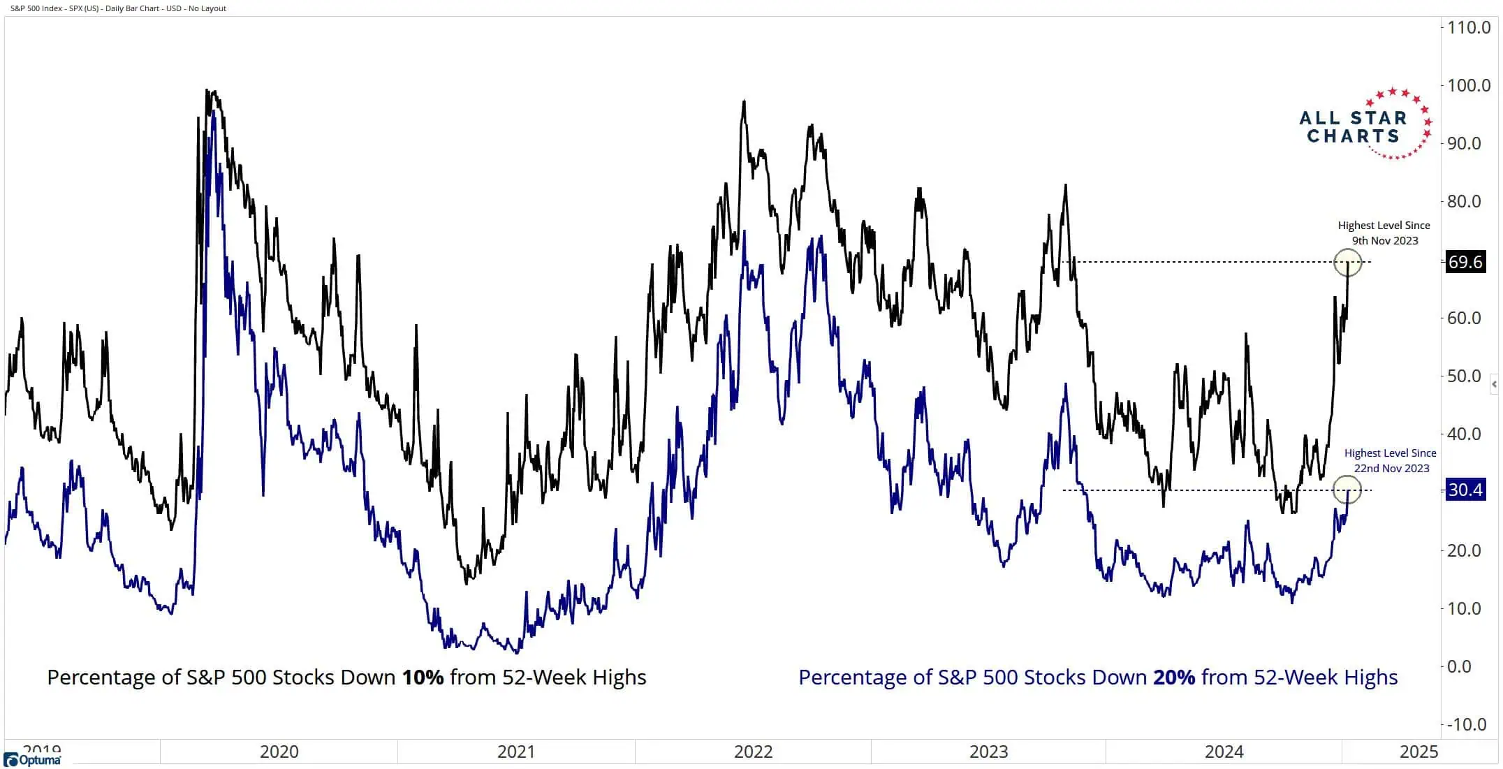 AllStarCharts: El 69% de las acciones del SP500 han bajado un 10% o más desde su máximo de 52 semanas. El 30% de las acciones del SP500 han bajado un 20% o más desde su máximo de 52 semanas. Niveles más altos desde noviembre de 2023.