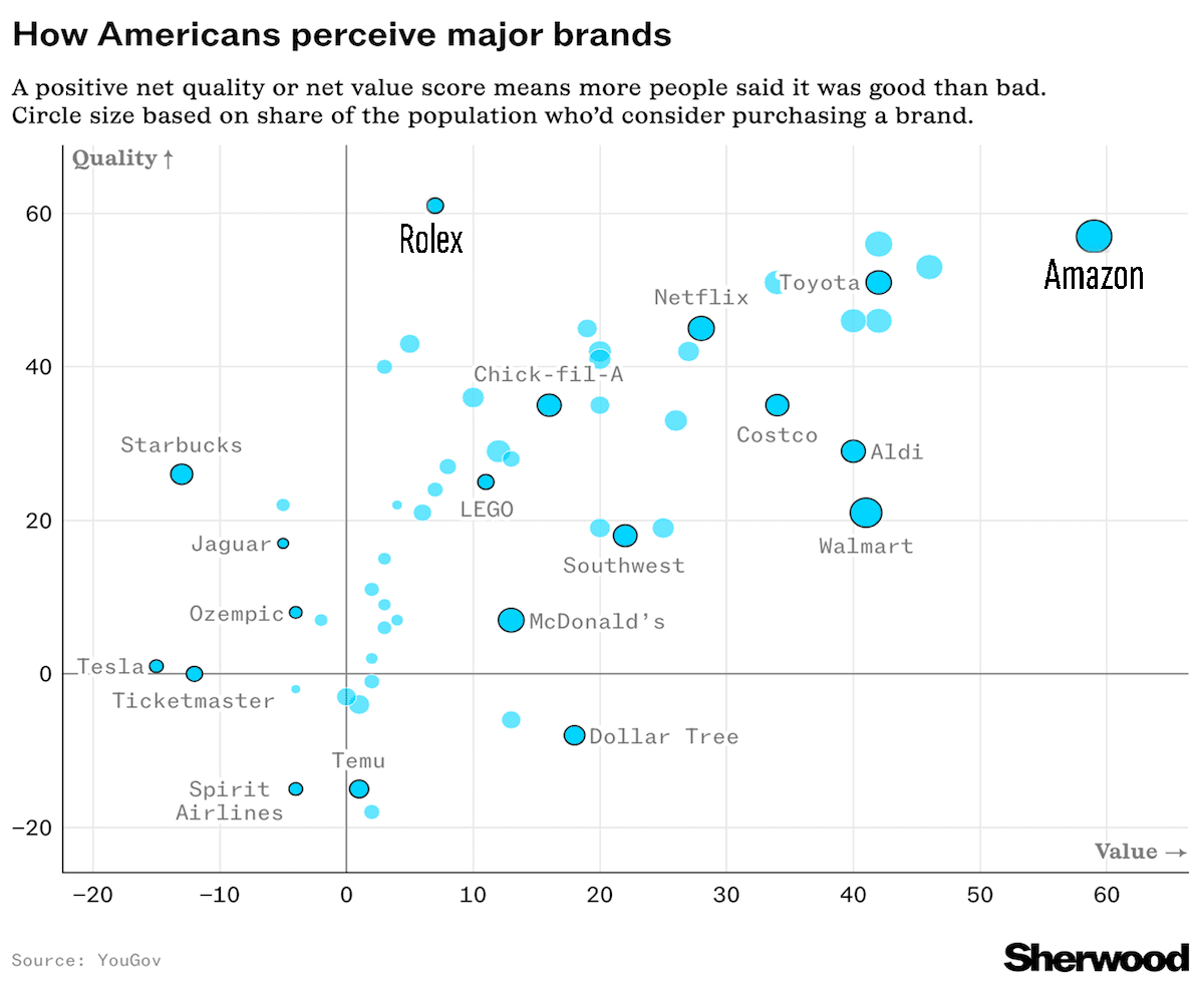 Chartr: Marcas relación calidad-precio por la empresa YouGov a más 19mil personas de EEUU, tamaño de circulo corresponde a encuestados que comprarían la marca.