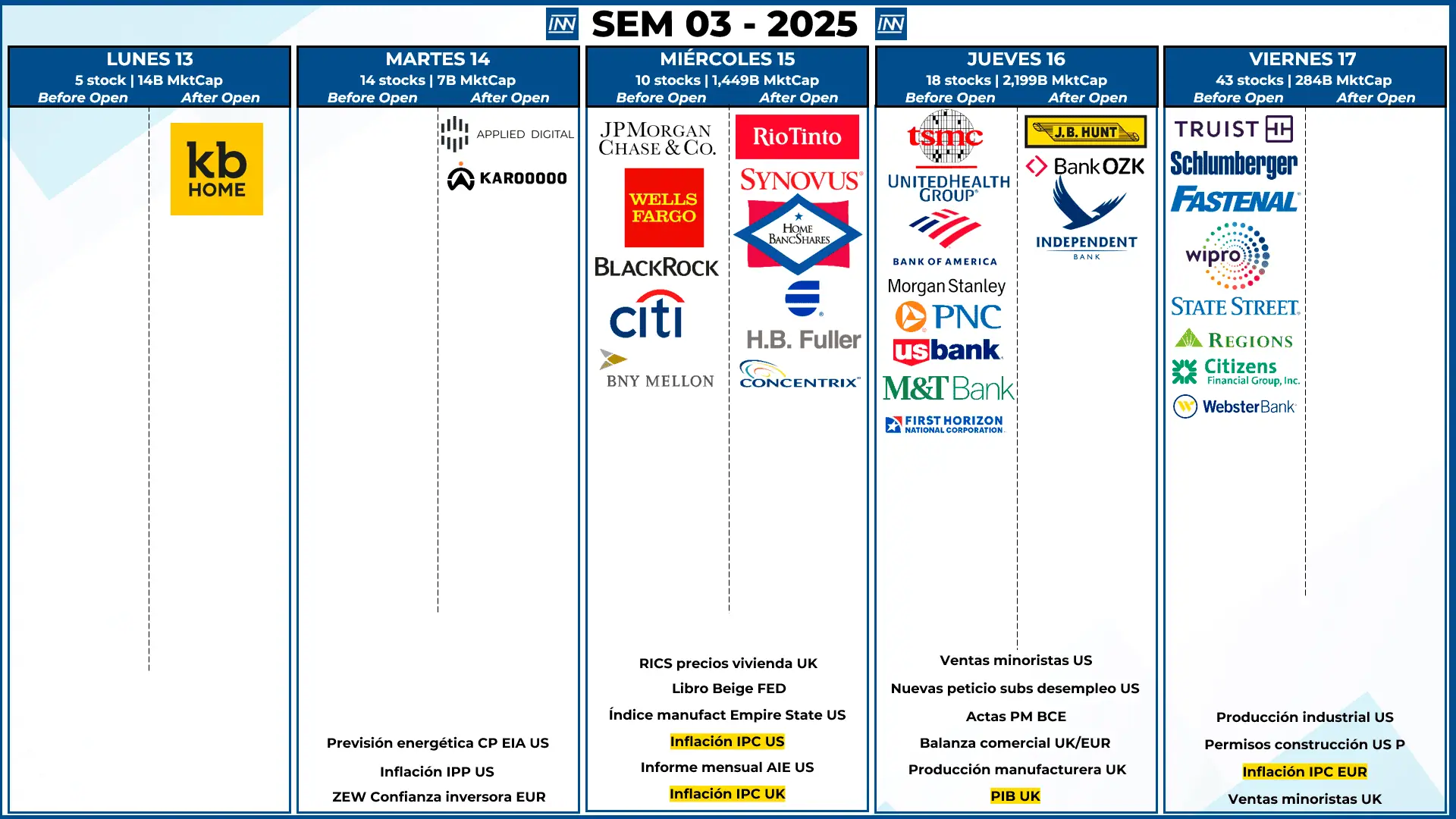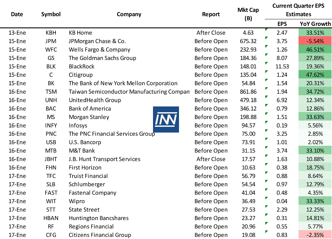 - Resultados Trimestrales: Inicia la temporada de resultados con las financieras: JPM, WFC, C, GS BAC, y además tenemos a TSM.
