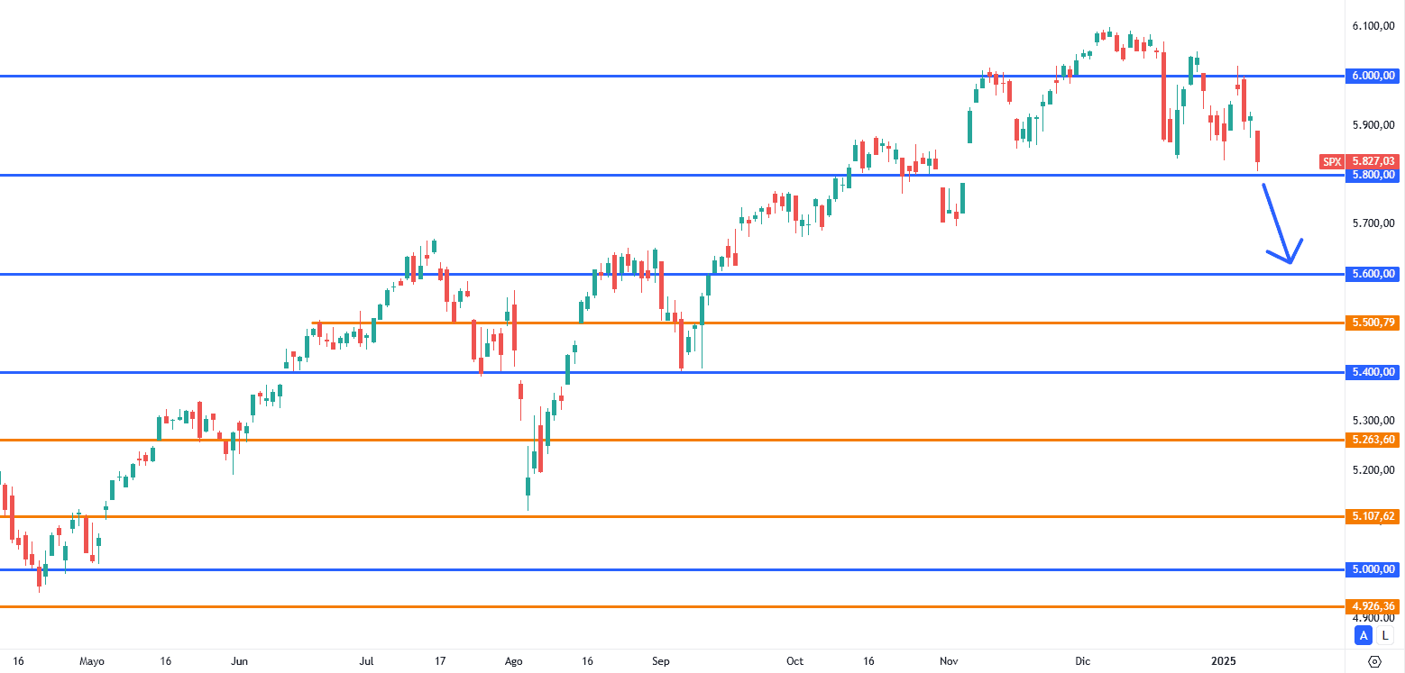 Durante la semana anterior el precio encontró, una vez más, los 6,000 puntos, y se perdieron debido a los últimos datos de empleo. Nos encontramos en una zona importante, si el sentimiento continúa negativo y si así los expresa el inicio de la temporada de resultados trimestrales, es posible que los 5,800 puntos se pierdan con miras a buscar el siguiente soporte en los 5,600 puntos.